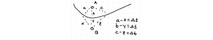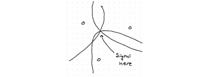 In the image above, delta t represents the time difference between when the signal arrived at the first antenna and the second antenna. Since we know the speed of the signal (the speed of light), we can calculate how much closer the transmitter is to antenna A than B based on how much longer it took to reach the second antenna. Unfortunately, that results in a set of possible solutions - those three equations show three possible solutions, but there is an infinite set anywhere along the curve drawn between the two antennas.
